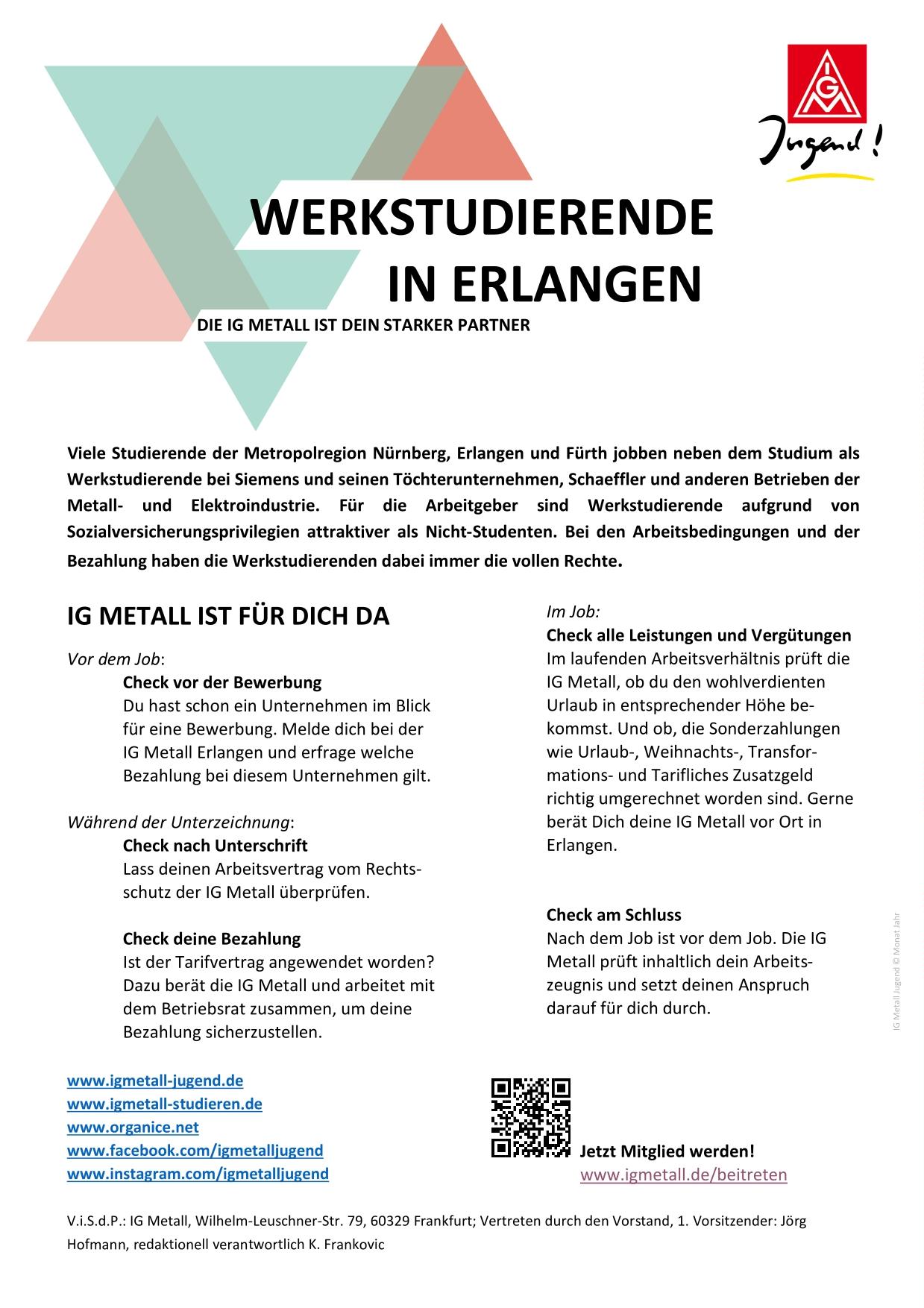 Viele Studierende der Region Nürnberg, Erlangen oder Bamberg jobben neben dem Studium als Werkstudierende bei Siemens und seinen Töchterunternehmen, Schaeffler und anderen Betrieben der Metall- und Elektroindustrie. Für die Arbeitgeber sind Werkstudierende aufgrund von Sozialversicherungsprivilegien attraktiver. Bei den Arbeitsbedingungen und der Bezahlung haben die Werkstudierenden immer die vollen Rechte.